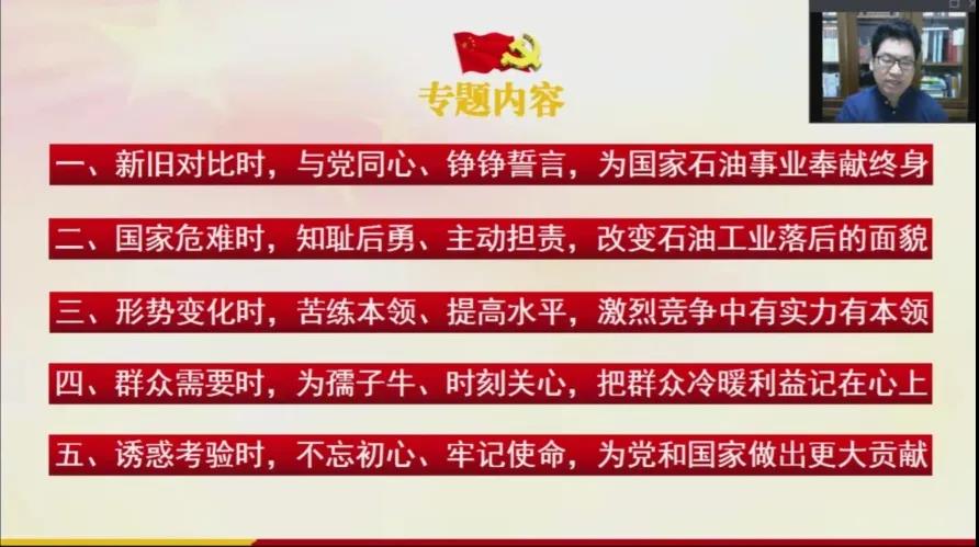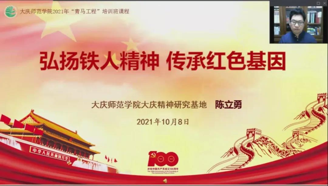 10月8日是“铁人”王进喜诞辰98周年纪念日,为深切缅怀“铁人”,追忆“铁人”的奋斗历程,传承和弘扬“铁人”精神;为科学化培养具有“忠诚的政治品格、浓厚的家国情怀、扎实的理论功底、突出的能力素质”的青年政治骨干,当日下午,公司“青马工程”培训班专题讲座在线上举行。太阳集团tyc9728陈立勇副教授作了题为《弘扬铁人精神 传承红色基因》的专题讲座。100名青马工程学员及老员工骨干参加了讲座。
