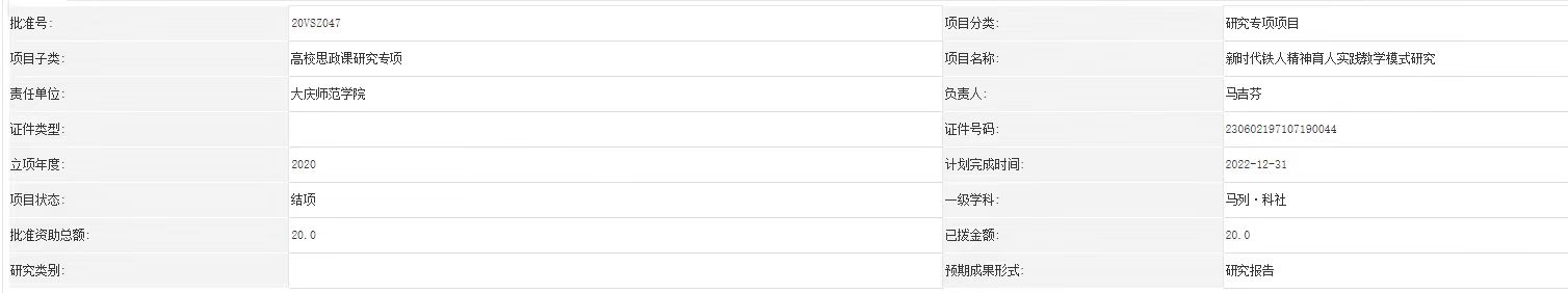 自课题立项后,马吉芬教授带领课题组成员张文彬、郭元阳、邹俊娟、郭明悦等严格按照国家社会科学基金的相关规定和要求开展研究,构建了以理论研究、课堂教学为核心的研究式、叙事性知-育融合;以国情调研、实地考察为导向的问题式、参与式行-育融合;以音乐舞蹈、书法绘画为载体的艺术式、展演式艺-育融合;以身临其境、忆苦思甜为主题的体验式、沉浸式境-育融合的铁人精神“四育四融”实践教学模式,实现铁人精神融入教学、课程、实践体系,实现将地缘、资源、团队转化为教学、育人、实践特色,实现了育人理念创新、育人路径创新、育人机制创新。