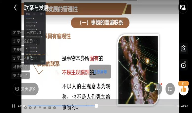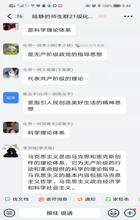 陈子轩(2021级应用化学专业2班):本学期马克思主义基本原理由陆老师来教授,虽然因为疫情,目前一直以钉钉线上直播授课方式进行,但这不但没有削减同学们学习的热情,反而通过陆老师独特的教学方式,让同学们更加珍惜每一节马原课。