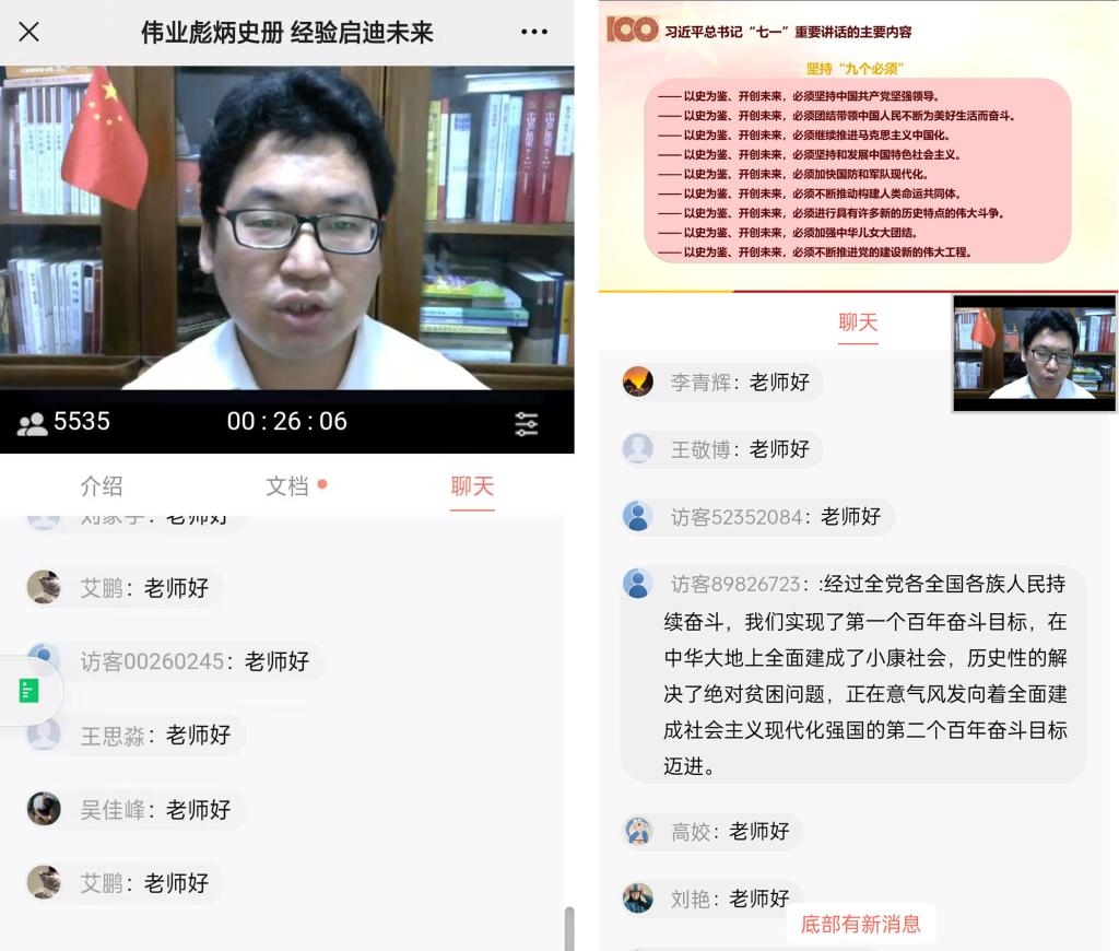为深入学习贯彻习近平总书记在庆祝中国共产党成立100周年大会上的重要讲话精神,教育引导广大青年员工听党话、感党恩、跟党走,以不负时代、不负韶华的奋进姿态开启2021年秋季学期新征程。公司于2021年8月31日18:30,开展了以学习贯彻“七一”重要讲话精神为内容的2021年秋季学期“开学第一课”活动,特邀“七一”重要讲话精神省委宣讲团成员、公司太阳集团tyc9728副教授陈立勇,通过超星学习通平台直播的方式给全体在校员工开课。