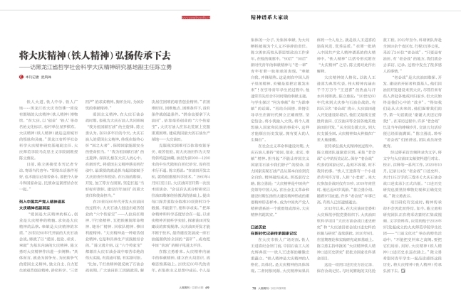 近日,公司黑龙江省哲学社会科学大庆精神研究基地副主任、太阳集团tyc9728副教授陈立勇作为红色文化研究专家接受人民日报《人民周刊》专访,就大庆精神(铁人精神)相关理论与实践问题展开系列解读。相关专访内容,以《将大庆精神(铁人精神)弘扬传承下去》为题发表在近日出版的《人民周刊》第9期“精神谱系大家谈”栏目中。